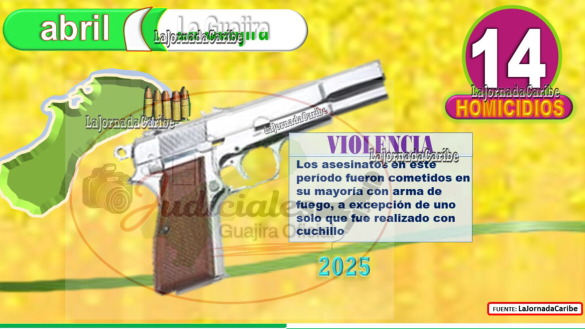 Abril dejo un total de 14 personas muertas violentamente en La Guajira, disminuyendo las cifras de homicidios con relación a los tres meses pasados. Riohacha tuvo siete asesinatos. Maicao cinco. Albania y La Jagua del Pilar finalizaron con un caso en cada territorio, rompiendo este último municipio, un record de cero homicidios que se mantuvo por dos años. El único caso de violencia de género en abril se presentó en Riohacha, donde una niña fue ultimada con cuchill0 . Las estadísticas del 2024 arrojaron 13 muertes violentas: Maicao cinco asesinatos, Riohacha y Fonseca con tres cada uno.